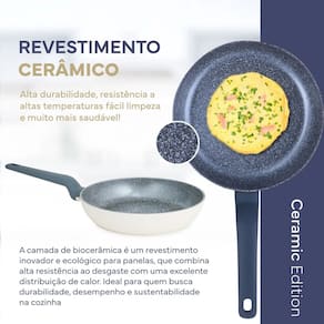 O kit completo é composto por duas caçarolas com tampa (24 cm e 20 cm), uma panela com tampa (18 cm), duas frigideiras (24 cm e 20 cm) e três utensílios em silicone espátula, colher e pegador de massas que ajudam a preservar o revestimento das panelas. Os cabos e alças são revestidos com material macio ao toque e resistentes ao calor, proporcionando segurança e conforto no manuseio.