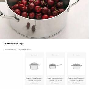 Cozinhar é um dos prazeres da vida, mas saborear pratos com aroma e sabor incomparáveis é melhor ainda E para que isso seja possível, a Tramontina lança o Jogo de Panelas Tramontina Una em Aço Inox com Fundo Triplo e Tampas de Vidro 3 Peças. Todas as peças são produzidas em aço inox com acabamento alto brilho e fundo triplo aço inox + alumínio + aço inox , que distribui o calor uniformemente, proporcionando um cozimento mais rápido e uniforme, economizando energia e deixando os alimentos aquecidos por mais tempo. Possuem tampa de vidro com saída de vapor e encaixe perfeito, e podem ser lavadas diariamente na máquina de lavar louças. Tenha produtos Tramontina e garanta satisfação nos momentos na cozinha Informações Gerais Mais saudável: por ser feita de aço inoxidável, a caçarola Tramontina não libera nenhum tipo de resíduo nas suas receitas. Fácil de usar: uma caçarola prática para todas as suas receitas e que faz bonito em qualquer tipo de fogão: gás, elétrico, vitrocerâmico e indução. Tampa de vidro com saída de vapor e encaixe perfeito. Mais durável: o inox Tramontina é uma matéria-prima nobre, resistente e que vai fazer bonito por muito mais tempo na cozinha. Economiza tempo e energia: o segredo está no fundo triplo aço inox + alumínio + aço inox , que distribui o calor uniformemente, proporcionando um cozimento mais rápido. Por isso, você pode manter o fogo baixo durante todo o preparo e, assim, poupar energia. Fácil de limpar: deixar sua caçarola brilhando é simples, você só precisa de água, sabão e uma esponja macia. Se preferir, é só colocar na máquina de lavar.