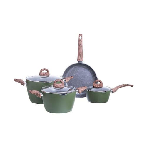 Fabricado em alumíniocom fundo de indução emaço inox, o Jogo de Panelas Jungleé feito para durar. Seu revestimento interno antiaderente em multicamadas permite cozinhar com pouco óleo, sem que os que os alimentos grudem no fundo. A limpeza é facilitada e as panelas se conservam belas por muito mais tempo. Os cabos são feitos embaquelite com acabamento soft touch e pintura em padrão amadeirado.