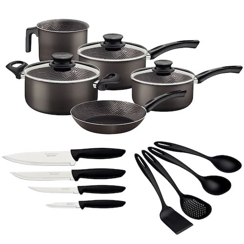 Jogo de Panelas Tramontina Paris em Alumínio com Revestimento Interno e Externo Antiaderente Starflon Max 5 Peças + Kit de Utensílios 4 peças Tramontina em Nylon Preto + Jogo de Facas Tramontina Plenus com Lâminas em Aço Inox e Cabos de Polipropileno Preto 04 Peças