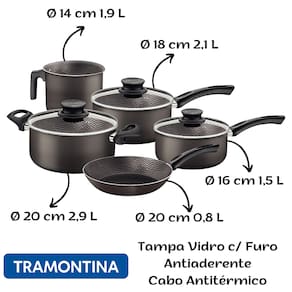 Panelas em alumínio com espessura que proporciona cozimento rápido e uniforme. Revestimento interno e externo de antiaderente Starflon Max que não gruda, é fácil de limpar, mais durável e não é prejudicial à saúde, pois é livre de PFOA. Tampas de vidro temperado, com saída de vapor e bordas de aço inox. Cabos, alças de baquelite antitérmico e pegadores de nylon que oferecem segurança durante o manuseio. Pode ser utilizada nos fogões: gás, elétrico e vitrocerâmico (resistência elétrica).