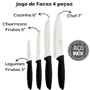 Facas com lâminas de aço inox com maior durabilidade do fio devido ao tratamento térmico. Cabos de polipropileno com maior resistência e durabilidade.