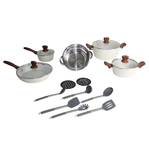 Jogo de panelas revestimento cerâmico antiaderente 18 peças Descubra a sofisticação e funcionalidade do jogo de panelas revestimento cerâmico antiaderente, a solução completa para transformar sua cozinha. Com revestimento antiaderente de alta qualidade e design moderno, é ideal para preparar suas receitas favoritas com praticidade e estilo Especificações técnicas: -material: revestimento de mármore antiaderente. Corpo feito em alumínio reforçado die-cast. com cabos de inox e silicone tornando resistente ao calor -compatibilidade: compatível com todos os modelos de fogões incluindo de indução -design: acabamento em textura marble para elegância e durabilidade Itens inclusos: -1 panela caçarola 26 cm + tampa -1 panela caçarola 20 cm + tampa -1 panela caçarola 16 cm + tampa -1 panela vaporizadora 20 cm -1 panela frigideira 28 cm + tampa -6 peças de conjunto de espátulas em silicone -2 suportes baquelites -1 puxador de tampa Dúvidas frequentes Todas as mercadorias estão disponíveis para entrega enquanto durarem os estoques. Obs: nós não efetuamos posteriores alterações de dados o cadastro é de responsabilidade do cliente com acesso restrito. 4. O produto tem Sim, todos os produtos são vendidos com do fabricante. 5. Quanto é o valor do O valor do varia de acordo com o cep do destino. Consulte o valor do na página do produto. 6. Qual é o prazo de entrega O prazo de entrega varia de acordo com o cep do destino e é calculado antes do pagamento. Você pode consultar o prazo de entrega direto na página do produto. 7. Como são realizadas as entregas Trabalhamos com serviço terceirizado de entregas gerido pelo canal onde você realizou sua compra, e por isso todas as nossas vendas são entregues por transportadoras contratadas pelo canal. Para acompanhar a entrega verifique seu pedido de compra no site onde você realizou sua compra. 8. Qual é o horário de atendimento De segunda à sexta, das 9h às 17h. Marca: Não Informado