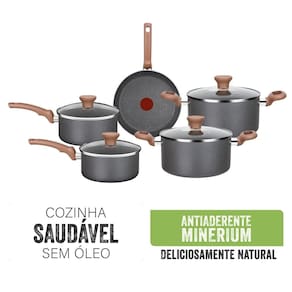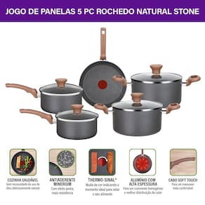 Cozinha saudável: Sem necessidade de óleo, deliciosamente natural.Antiaderente Minerium: Com efeito pedra, mais resistência.Thermo-Sinal: Muda de cor indicando o momento ideal para selar seu alimento.Alumínio de alta espessura: Com 2mm para um cozimento homogêneo e melhor distribuição de calor.Cabo soft touch: Para um manuseio mais confortável.Além de contar com a qualidade da marca Rochedo, presente no Brasil há mais de 100 anos, o Jogo de Panelas Rochedo Natural Stone 5 peças é livre de substâncias tóxicas (PFOA), garantindo a segurança no uso do produto. Pode ser utilizado em fogão a gás, vitrocerâmico e elétrico, podendo também ser levado à máquina de lavar louças.