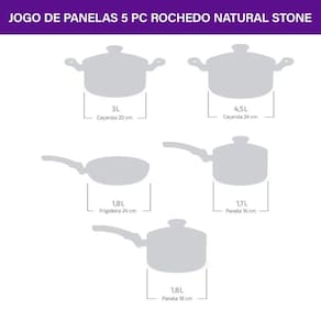 Jogo de Panelas Rochedo Natural Stone Minerium 5 Peças Linha Rochedo Natural Stone, cozinha saudável sem necessidade de óleo com antiaderente Minerium, deliciosamente natural, possui um efeito pedra que traz mais resistência e modernidade para a sua cozinha. O Jogo de Panelas Rochedo Natural Stone 5 peças é ideal para preparar suas receitas preferidas com mais sabor e menos gordura, composto por: Frigideira 24cm 1,8L Caçarola 24cm 4,5L Caçarola 20cm 3L Panela 18cm 1,8L Panela 16cm 1,7L