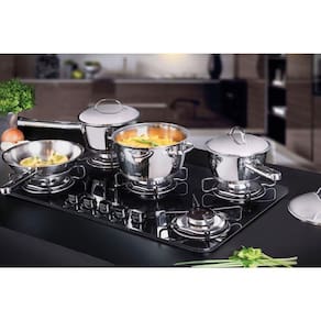 Acompanham tampas de inox com saída de vapor e encaixe perfeito, garantindo muito estilo. O acabamento em alto brilho faz delas panelas modernas que embelezam sua cozinha. Fáceis de limpar, possuem desenho sem cantos que facilitam a limpeza, além de poderem ser lavadas diariamente na máquina de lavar louças. Versáteis, podem ser utilizadas nos fogões à gás, elétrico, vitrocerâmico e indução. É um jogo perfeito para você ter uma cozinha mais completa!