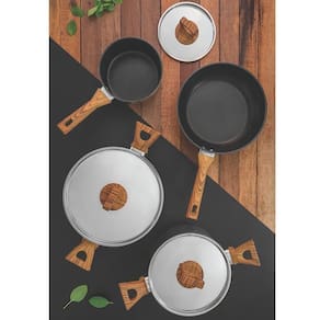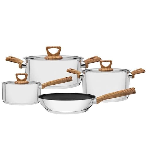 Modelo: Brava Antiaderente em Aço Inox com Fundo Triplo Cabos e Alças com Acabamento Efeito Amadeirado 4 Peças 65300310
