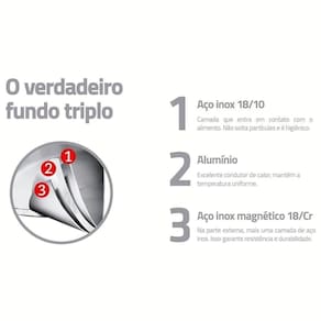 O fundo triplo (aço inox + alumínio + aço inox) distribui o calor de forma uniforme e rápida, garantindo um cozimento mais eficiente e economia de energia.