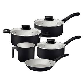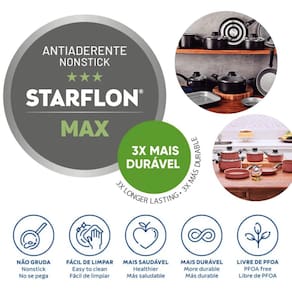 Aprimore sua cozinha com o jogo de panelas Tramontina Linz em alumínio com revestimento interno e externo em antiaderente Starflon Max preto 5 peças. Essenciais para quem não abre mão da funcionalidade na cozinha, este jogo tem peças que evitam que os alimentos grudem, mesmo cozinhando de maneira rápida e uniforme. Tudo isso, graças a produção em alumínio com revestimento interno e externo e Starflon Max. As tampas de vidro temperado com bordas de aço inox permitem acompanhar o preparo com segurança, e os cabos e alças de baquelite antitérmico, junto com os pegadores de nylon, oferecem conforto e segurança no manuseio. Além de todas essas características, o jogo pode ir em fogões a gás, elétricos e vitrocerâmicos, é lavável em máquina de lavar louças, e proporcionará toda a praticidade ao seu dia a dia na cozinha Composição 1 Caçarola 20 cm 2,8 L; 1 Fervedor 12 cm 1,1 L ; 1 Frigideira 20 cm 0,8 L; 1 Panela 16 cm 1,4 L; 1 Panela 18 cm 2 L. Marca: Não Informado