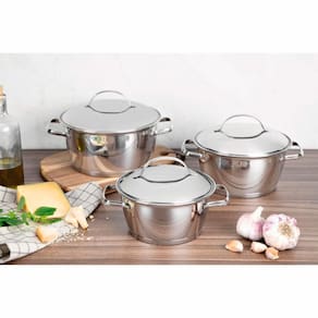 O Jogo de Panelas Tramontina Allegra em Aço Inox com Fundo Triplo e Tampas de Inox 3 Peças vai tornar sua cozinha mais completa! Produzidas totalmente em aço inox, as três peças possuem fundo triplo (aço inox + alumínio + aço inox), característica que distribui o calor de forma uniforme, proporcionando um cozimento mais rápido e deixando os alimentos aquecidos por mais tempo, além de economizar mais energia. Estilosas, possuem acabamento em alto brilho que fazem delas protagonistas na hora de preparar e servir alimentos. Acompanham tampa com saída de vapor e encaixe perfeito. Muito fáceis de limpar, possuem desenho sem cantos que facilita a limpeza, além de poderem ser lavadas diariamente na máquina de lavar louças. São ainda panelas versáteis que pode ser utilizadas em diferentes tipos de fogões. Garanta o seu jogo e prepare as melhores receitas!
