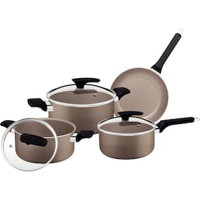 O Jogo de Panelas Tramontina Alumínio Milazzo Amêndoas 4 Peças combina praticidade, segurança e elegância para sua cozinha. Com revestimento interno e externo antiaderente Starflon Max, é fácil de limpar, resistente e seguro para a saúde, pois é livre de PFOA. Suas tampas de vidro temperado com borda de aço inox permitem acompanhar o preparo sem perder calor, enquanto as alças e cabos de baquelite antitérmico com acabamento soft-touch garantem conforto no manuseio. Compatível com fogões a gás, elétricos e vitrocerâmicos, oferece versatilidade para qualquer preparo. Características: Marca: Tramontina Código do Fabricante: 28599460 Linha: Milazzo Cor: Amêndoas Material: Alumínio Material da Tampa: Vidro temperado Material Pegadores: Nylon Material Alças/Cabos: Baquelite antitérmico Antiaderente: Sim Fogões Compatíveis: Gás, elétricos e vitrocerâmicos Conteúdo: 1 Caçarola 20cm 2.9L, 1 Caçarola 24cm 4.9L, 1 Frigideira 24cm 1.2L e 1 Panela 18cm 2.1L Compatível com Micro-ondas: Não Compatível com Lava-louças: Não Pode ir ao Forno: Não Saída de vapor: Sim Livre de PFOA: Sim Marca: Não Informado