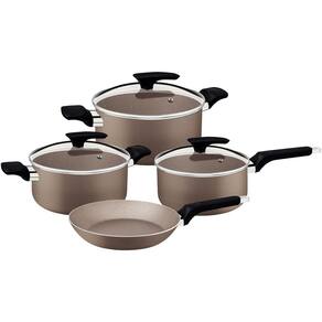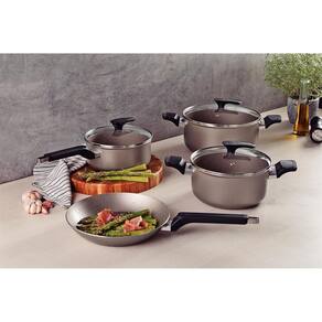 O Jogo de Panelas Tramontina Alumínio Milazzo Amêndoas 4 Peças combina praticidade, segurança e elegância para sua cozinha. Com revestimento interno e externo antiaderente Starflon Max, é fácil de limpar, resistente e seguro para a saúde, pois é livre de PFOA. Suas tampas de vidro temperado com borda de aço inox permitem acompanhar o preparo sem perder calor, enquanto as alças e cabos de baquelite antitérmico com acabamento soft-touch garantem conforto no manuseio. Compatível com fogões a gás, elétricos e vitrocerâmicos, oferece versatilidade para qualquer preparo. Características: Marca: Tramontina Código do Fabricante: 28599460 Linha: Milazzo Cor: Amêndoas Material: Alumínio Material da Tampa: Vidro temperado Material Pegadores: Nylon Material Alças/Cabos: Baquelite antitérmico Antiaderente: Sim Fogões Compatíveis: Gás, elétricos e vitrocerâmicos Conteúdo: 1 Caçarola 20cm 2.9L, 1 Caçarola 24cm 4.9L, 1 Frigideira 24cm 1.2L e 1 Panela 18cm 2.1L Compatível com Micro-ondas: Não Compatível com Lava-louças: Não Pode ir ao Forno: Não Saída de vapor: Sim Livre de PFOA: Sim Marca: Não Informado