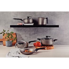 O Jogo de Panelas Tramontina Alumínio Milazzo Amêndoas 5 Peças combina praticidade, segurança e elegância para sua cozinha. Com revestimento interno e externo antiaderente Starflon Max, é fácil de limpar, resistente e seguro para a saúde, pois é livre de PFOA. Suas tampas de vidro temperado com borda de aço inox permitem acompanhar o preparo sem perder calor, enquanto as alças e cabos de baquelite antitérmico com acabamento soft-touch garantem conforto no manuseio. Compatível com fogões a gás, elétricos e vitrocerâmicos, oferece versatilidade para qualquer preparo. Características: Marca: Tramontina Código do Fabricante: 28599461 Linha: Milazzo Cor: Amêndoas Material: Alumínio Material da Tampa: Vidro temperado Material Pegadores: Nylon Material Alças/Cabos: Baquelite antitérmico Antiaderente: Sim Fogões Compatíveis: Gás, elétricos e vitrocerâmicos Conteúdo: 1 Caçarola 20cm 2.9L, 1 Fervedor 14cm 1.9L, 1 Frigideira 20cm 0.8L, 1 Panela 16cm 1.5L e 1 Panela 18cm 2.1L Compatível com Micro-ondas: Não Compatível com Lava-louças: Não Pode ir ao Forno: Não Saída de vapor: Sim Livre de PFOA: Sim Marca: Não Informado