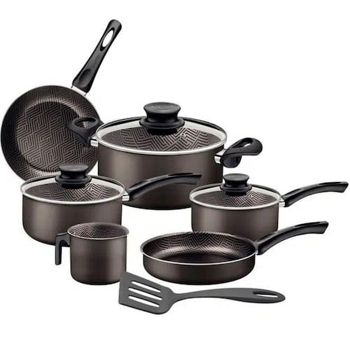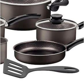 Características: Marca: Tramontina Modelo: Paris Tipo: Jogo de panelas Quantidade de peças: 7 peças Diâmetro das panelas: Caçarola: 22 cm | Panelas: 18 cm e 16 cm | Fervedor 12 cm | Frigideiras 20 cm e 18 cm Capacidade em litros: Caçarola: 3,8 litros | Panelas: 2,1 litros e 1,5 litros | Fervedor: 1,2 litros | Frigideiras: 1,4 litros e 0,6 litros Material: Alumínio Revestimento interno: Antiaderente starflon Revestimento externo: Antiaderente starflon Tampa: Vidro temperado com bordas de aço inox e saída de vapor Cabos: Baquelite antitérmico Alças: Baquelite antitérmico Pegador: Nylon Utensílio: Sim Quantidade de utensílio: 01 espátula Material do utensílio: Nylon ability Pode ser levado a: Lava louças