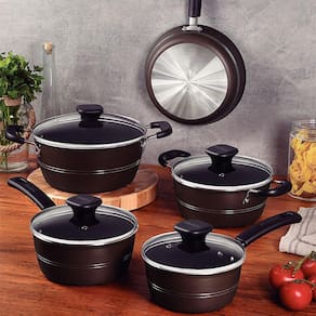 Segurança a toda prova As panelas possuem revestimento antiaderente starflon excellent, tampa de vidro temperado com direito a saída de vapor, além de cabos e alças antitérmicos. Assim, os alimentos não grudam, você se protege contra incidentes e ganha muita praticidade no manuseio. Feito em alumínio, o modelo vai te servir por muito tempo com garantia de satisfação.