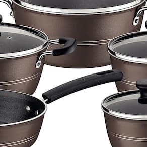 Prepare receitas deliciosas com a facilidade e segurança que você e sua família merecem, usando o Jogo de Panelas Tramontina Sicília. São 5 peças entre caçarolas, panelas e frigideira.