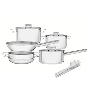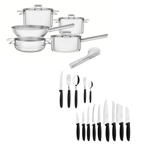 Jogo de Panelas Tramontina Brava Aço Inox 5 Peças Fundo Triplo + Pegador de MassaO Jogo de Panelas Tramontina em Aço Inox Fundo Triplo com Tampa Plana 5 Peças é ideal para quem aprecia a mistura de traços modernos com a elegância do aço inox para deixar sua cozinha linda. Totalmente feitas de aço inox com fundo triplo (aço inox + alumínio + aço inox), elas distribuem o calor uniformemente, proporcionando um cozimento mais rápido para os alimentos. Podem ser usadas em qualquer tipo de fogão e lavadas diariamente em máquina de lavar louças. O jogo de panelas é perfeito para quem adora funcionalidade e beleza na sua cozinha.Características - Mais saudável: por ser feita de aço inoxidável, a panela Tramontina não libera nenhum tipo de resíduo nas suas receitas. - Fácil de usar: uma panela prática para todas as suas receitas e que faz bonito em qualquer tipo de fogão: gás, elétrico, vitrocerâmico e indução. Ainda possui tampa com saída de vapor e encaixe perfeito. - Mais durável: o inox Tramontina é uma matéria-prima nobre, resistente e que vai fazer bonito por muito mais tempo na cozinha. - Economiza tempo e energia: o segredo está no fundo triplo (aço inox + alumínio + aço inox), que distribui o calor uniformemente, proporcionando um cozimento mais rápido. Por isso, você pode manter o fogo baixo durante todo o preparo e, assim, poupar energia. - Fácil de limpar: deixar sua panela brilhando é simples, você só precisa de água, sabão e uma esponja macia. Se preferir, é só colocar na máquina de lavar.Componentes- 1 62401200 Panela Tramontina Brava em Aço Inox Fundo Triplo com Tampa Plana e Cabo 20 cm de 2,60 L- 1 62404160 Caçarola Tramontina Brava Funda em Aço Inox Fundo Triplo com Tampa Plana e alça 16 cm 1,8 L- 1 62404200 Caçarola Tramontina Brava Funda em Aço Inox Fundo Triplo com Tampa Plana e alça 20 cm 3,60 L- 1 62410200 Cozi-Vapore Brava Tramontina em Aço Inox com Alça 20 cm 2,2 L- 1 62415240 Frigideira Tramontina Brava em Aço Inox Fundo Triplo com Cabo 24 cm 2,20 L- 1 63800605 Pegador de Massa Faqueiro Tramontina Ipanema Plenus 39 Peças Kit CozinhaQuem preza por uma cozinha completa, com itens que tornem o preparo das receitas e a hora de saboreá-las ainda mais prático, precisa conhecer o kit cozinha Tramontina com lâminas em aço inox e cabos de polipropileno preto 39 peças. Composto por peças perfeitas para lhe acompanhar diariamente, como facas, cutelo e talheres de mesa, ele vai deixar suas atividades na cozinha muito mais práticas e eficientes. Elas são produzidas com lâminas em aço inox, onde as facas tem aplicação de tratamento térmico que oferece maior poder de corte e durabilidade em seu fio e os garfos e colheres contam com maior resistência devido a estampagem e espessura do aço. Todos os cabos são em polipropileno, têm formato que proporcionam um manuseio mais seguro, pois garantem maior firmeza. Além de todas essas características, as peças do kit podem ser levadas à máquina de lavar louças, levando maior facilidade para seu dia a dia na cozinha. Escolha Tramontina e veja sua casa e sua cozinha serem transformadas!Características- Atende 6 pessoas.- Lâminas de aço inox. - As lâminas das facas têm maior durabilidade do fio devido ao tratamento térmico. - Os garfos e colheres garantem maior resistência devido a espessura do aço e a estampagem das lâminas. - Os cabos de polipropileno possuem maior resistência e durabilidade. - Podem ir à máquina de lavar louças facilitando seu dia a dia.Componentes- 6 23360005 Faca Churrasco inox 5" Ipanema Preto- 6 23362000 Garfo Mesa inox Ipanema Preto- 6 23363000 Colher Mesa inox Ipanema Preto- 6 23365000 Garfo Sobremesa inox Ipanema Preto- 6 23367000 Colher Chá inox Ipanema Preto- 1 23410005 Faca Churrasco/Frutas inox 5" Plenus Preto- 1 23419003 Faca Tornear inox 3" Plenus Preto - 1 23420003 Faca Legumes/Frutas inox 3" Plenus Preto - 1 23422007 Faca Pão inox 7" Plenus Preto- 1 23425005 Faca Dessossar inox 5" plenus Preto- 1 23426007 Faca do Chef inox 7" Plenus Preto- 1 23428005 Faca Tomate inox 5" Plenus Preto - 1 23430005 Cutelo Inox 5" Plenus Preto- 1 23442005 Faca Santoku inos 5" Plenus PretoGarantia do Fabricante- 3 meses contra defeito de fabricaçãoAtendimento Tramontina- SAC (11) 4197-1266 / atendimento@tramontina.com