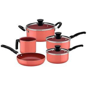 INFORMAÇÕES GERAIS DO JOGO DE PANELAS TRAMONTINA ALUMÍNIO COM REVESTIMENTO INTERNO CERÂMICO E EXTERNO DE SILICONE CORAL 5 PEÇAS - Corpo de alumínio com espessura que proporciona cozimento rápido e uniforme. - Revestimento interno cerâmico e externo de silicone. - Tampas de vidro temperado, com saída de vapor e bordas de aço inox. - Cabos e alças de baquelite antitérmico e pegadores de nylon que proporciona redução da propagação de calor, aumentando a e melhorando a empunhadura. - Podem ir à máquina de lavar louças facilitando seu dia a dia.