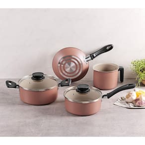 O jogo de panelas Tramontina Linz em alumínio com revestimento interno e externo em antiaderente Starflon Max mocaccino 4 peças é ideal para quem busca praticidade e bom desempenho no preparo das refeições. Com corpo em alumínio, garante aquecimento rápido e uniforme. O revestimento antiaderente interno e externo evita que os alimentos grudem e facilita a limpeza. Os cabos, alças e pegadores são antitérmicos, oferecendo segurança durante o uso, e as tampas em vidro temperado com bordas em aço inox auxiliam no acompanhamento do preparo. Um conjunto funcional para a rotina na cozinha.
