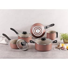 O jogo de panelas Tramontina Linz em alumínio com revestimento interno e externo em antiaderente Starflon Max macaccino 5 peças oferece praticidade e eficiência para o preparo das refeições do dia a dia. Produzidas em alumínio, as peças aquecem de forma rápida e uniforme, garantindo um cozimento eficaz. O revestimento antiaderente evita que os alimentos grudem e facilita a limpeza. Os cabos, alças e pegadores antitérmicos proporcionam segurança no manuseio, enquanto as tampas de vidro temperado com bordas em aço inox auxiliam no acompanhamento das receitas. Um conjunto completo para tornar sua rotina na cozinha mais funcional.
