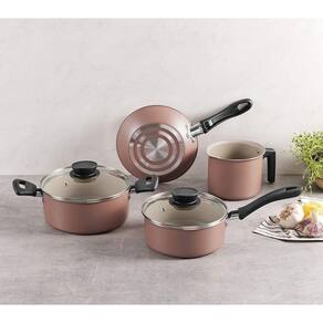 Caçarola, panelas e frigideira com 1,2 mm de espessura e fervedor com 1,4 mm, espessuras que proporcionam cozimento rápido e uniforme. Revestimento interno e externo de antiaderente Starflon Max que não gruda, é fácil de limpar, mais durável e não é prejudicial à saúde, pois é livre de PFOA.Tampas de vidro temperado com bordas de aço inox.Cabos, alças de baquelite antitérmico e pegadores de nylon que oferecem segurança durante o manuseio. Pode ser utilizada nos fogões: gás, elétrico e vitrocerâmico ? resistência elétrica. Podem ir à máquina de lavar louças facilitando seu dia a dia.