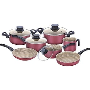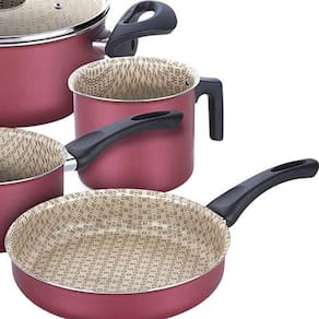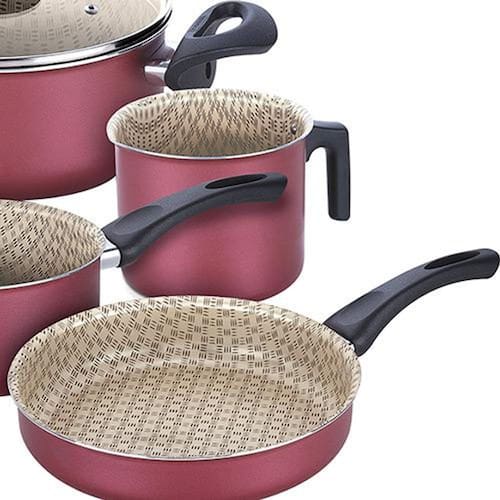 Ficha Técnica Marca: Tramontina Coleção: Paris Cor: Cereja Quantidade de peças: 7 Peças Material: Alumínio Cabo: Cabos e alças são em baquelite antitérmico, o que proporciona um manuseio seguro e confortável. Antiaderente: Sim
