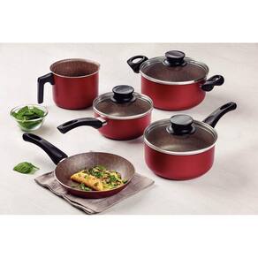 Jogo de Panelas Tramontina Paris Texture em Alumínio com Revestimento Interno e Externo Antiaderente Starflon Max Vermelho 5 Peças Corpo de alumínio com espessura que proporciona cozimento rápido e uniforme. Revestimento interno e externo de antiaderente Starflon Max que não gruda, é fácil de limpar, mais durável e não é prejudicial a saúde.Tampas de vidro temperado com saída de vapor e borda de aço inox.Cabos, alças de baquelite antitérmico e pegadores de nylon que oferecem segurança durante o manuseio. Podem ir à máquina de lavar louças facilitando seu dia a dia. Recomendações de uso A capacidade volumétrica máxima para cozimento é de 3/4 da capacidade total da peça. Posicione os cabos dos utensílios voltados ao centro do fogão.Em fogões com grade, centralize a peça e alinhe o cabo com a grade. Utensílios quentes devem estar fora do alcance das crianças. Este produto não pode sofrer modificações. Antes do primeiro uso, lave com esponja macia, sabão neutro ou detergente líquido. Depois de secar, unte a área interna com óleo ou gordura e leve ao fogo por um ou dois minutos. Deixe esfriar e lave novamente.Seu utensílio Starflon está pronto para uso com ou sem gordura, sempre em fogo baixo ou médio (nunca superior a 350ºC). Para mexer os alimentos use somente utensílios de silicone, nylon ou madeira. Com o uso, o pegador pode afrouxar devido à dilatação normal dos materiais. Reaperte apenas o suficiente, sem forçar. Limpeza: Evite a imersão do utensílio quente em água fria.Nunca utilize produtos abrasivos na lavagem. Se deixar queimar alimentos, umedeça a área e reserve até que possa remover os resíduos grudados com esponja e sabão. Para descarte dos produtos e embalagens siga as orientações de reciclagem vigentes.