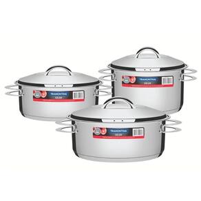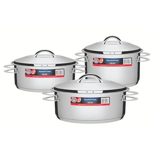 Linha/Coleção - SolarMaterial - Aço InoxEspessura - 0,7 mmCor - Aço InoxAcabamento - Alto BrilhoTampa(s) - Aço InoxAlças e Cabos - Aço InoxQuantidade de Peças - 3Revestimento Interno - Aço InoxRevestimento Externo - Aço InoxCabo perfurado - SimFundo triplo - SimComposição - 01 Caçarola rasa 24 cm 4,70 L Solar;01 Caçarola rasa 28 cm 7,10 L Solar;01 Caçarola funda 24 cm 6,10 L Solar.Tampa(s) com saída de de vapor - SimPodem ser utilizadas nos fogões - Gás, elétrico, vitrocerâmico e induçãoÉ adequado para lava-louças - SimMarca - TramontinaMais Informações - Mais saudável: por ser feita de aço inoxidável, a panela Tramontina não libera nenhum tipo de resíduo nas suas receitas.Fácil de usar: uma panela prática para todas as suas receitas e que faz bonito em qualquer tipo de fogão: gás, elétrico, vitrocerâmico e indução. Ainda possui tampa com saída de vapor e encaixe perfeito.Mais durável: o inox Tramontina é uma matéria-prima nobre, resistente e que vai fazer bonito por muito mais tempo na cozinha.Economiza tempo e energia: o segredo está no fundo triplo (aço inox + alumínio + aço inox), que distribui o calor uniformemente, proporcionando um cozimento mais rápido. Por isso, você pode manter o fogo baixo durante todo o preparo e, assim, poupar energia. Além disso, a panela toda em aço inox pode ir ao forno para gratinar ou finalizar pratos, na temperatura máxima de 260C.Fácil de limpar: deixar sua panela brilhando é simples, você só precisa de água, sabão e uma esponja macia. Se preferir, é só colocar na máquina de lavar.