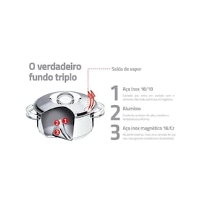 Recomendações de Uso - A capacidade volumétrica máxima para cozimento é de 3/4 da capacidade total da peça.Antes do uso, remova as eventuais etiquetas presentes no produto, e em seguida recomendamos lavar.Use uma fonte de calor sempre baixa, para evitar que o alimento grude no fundo da panela.O fundo triplo distribui uniformemente o calor, não sendo necessário o fogo alto. E, além disso, você economiza energia.Quando a panela for utilizada no fogão a gás, a chama não deve ultrapassar a base da panela. No caso de uso de chapa elétrica, a chapa deverá ter diâmetro igual ou inferior ao da panela.Não aqueça o alimento colocando uma panela ou qualquer utensílio do mesmo diâmetro um sobre o outro. Esse procedimento é perigoso, pois cria vácuo e impossibilita a retirada.Não deixe a panela vazia sobre uma fonte de calor.Peso - 5,80 kgGarantia - 12 meses de garantia legal para vícios ou defeitos de fabricaçãoEAN - 7898971420162