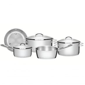 Totalmente produzidas em aço inox,o Conjunto de Panelas em Aço Inox com Fundo Triplo e Tampas de Inox 5 Peças Tramontina Solaras, mantém os alimentos saudáveis já que o material não solta resíduos. Trazem ainda a tecnologia de fundo triplo (aço inox + alumínio + aço inox) que distribui o calor uniformemente, proporcionando um cozimento mais rápido e uniforme, economizando energia e deixando os alimentos aquecidos por mais tempo. São peças versáteis que podem ir ao forno para gratinar ou finalizar pratos na temperatura máxima de 260C e ser utilizadas em diferentes tipos de fogões. Podem ir à máquina de lavar louças diariamente. Garanta uma cozinha completa com esse jogo de panelas clássico da Tramontina!