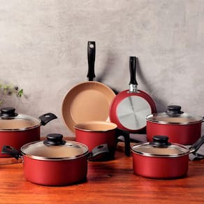 Se você busca deseja uma cozinha completa e preparada para o preparo das suas refeições, conte com o jogo de panelas Tramontina Turim em alumínio com revestimento interno e externo em antiaderente Starflon Max vermelho 07 peças. Com ele, você tem os itens essenciais para garantir um arroz soltinho, um refogado de legumes ou um bife grelhado suculento de maneira rápida e uniforme, sem grudar na superfície, pois a produção de suas peças é em alumínio com revestimento Starflon Max. Os cabos, alças e pegadores são em materiais antitérmicos, não aquecem e proporcionam maior segurança no manuseio. Além de todas essas características, o jogo pode ir à máquina de lavar louças e tem panelas e caçarolas com tampas de vidro temperado com bordas de aço inox!