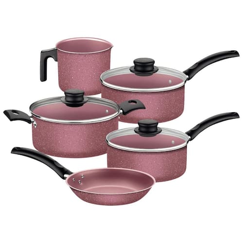 O jogo de panelas Tramontina Turim em aluminio com revestimento interno e externo em antiaderente Starflon Max rosa 05 peças é a escolha ideal para tornar a sua experiência na cozinha ainda mais prática e prazerosa. Com um corpo de alumínio com espessura especial, suas peças proporcionam um cozimento rápido e uniforme, sem que grudem em sua superfície, pois ainda contam com revestimento interno e externo em antiaderente Starflon Max. As panelas e caçarola do jogo vem com tampas de vidro temperado com bordas de aço inox e para sua segurança, possuem cabos, alças e pegadores em materiais antitérmicos, que reduzem a propagação de calor. Os benefícios incríveis do jogo não param por aí, pois elas podem ser lavadas na máquina de lavar louças e utilizadas nos fogões a gás, elétricos e vitrocerâmicos. Um jogo que alia funcionalidade, beleza e durabilidade, que irá aprimorar sua experiência na cozinha!