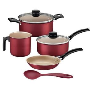 Conteúdo da embalagem: - 1 Frigideira 18 cm - 0,7 L - 1 Caçarola 18 cm - 2 L - 1 Panela 16 cm - 1,4 L - 1 Fervedor 12 cm - 1,0 L - 1 Colher de Nylon Vermelha