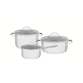 Composição - 1 Panela 16 cm 1,4 Litros;1 Caçarola funda 20 cm 3,6 Litros;1 Caçarola 24 cm, 4,8 Litros.
