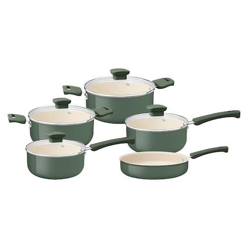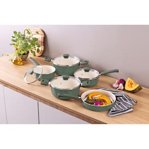 O corpo das panelas é produzido em alumínio reciclado, que garante um aquecimento rápido e uniforme, economizando tempo e energia. O grande diferencial está no revestimento interno cerâmico, que permite um cozimento mais direto e saudável, exigindo menos óleo e facilitando a limpeza. Além disso, os cabos e pegadores são fabricados com polímeros de alta circularidade, sendo 100% recicláveis e altamente resistentes ao calor.