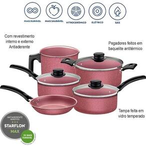 O jogo de panelas Turim Starflon Max Rosa 5PSC 20298461 da Tramontina combina estilo e funcionalidade em sua cozinha. Com cinco peças de alta qualidade e um atraente acabamento rosa, essas panelas apresentam o revestimento antiaderente Starflon Max para um cozimento uniforme e fácil limpeza. Adicione um toque de elegância à sua culinária com este conjunto de panelas Turim da Tramontina.