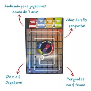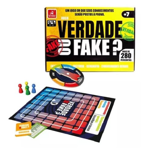 Cada participante seleciona uma cor de peão e o coloca no início.As cartas, viradas para baixo, são separadas em montes por tema (história, entretenimento, geografia e conhecimentos gerais).Como jogarO jogo consiste em atravessar o tabuleiro conquistando o maior número de cartas possível. Para isso, os participantes precisam responder de forma correta as perguntas das cartas com "Verdadeiro" ou "Falso". Cada competidor, em sua vez, avança uma casa e gira a roleta para saber o tema da questão que vai responder. Depois, sem olhar, o jogador deve entregar ao adversário uma carta do tema sorteado ou escolhido (caso a roleta aponte para "Escolha o tema") para que ele leia uma das quatro questões. Se o competidor acertar, permanece com a carta; se não, a devolve colocando-a no monte por debaixo.Se a roleta indicar "Azar", o jogador da vez não responderá uma questão, mas sim duas para ganhar a carta. Por outro lado, se a roleta indicar "Desafio", quem deverá responder duas questões e um dos adversários escolhido pelo jogador que se acertar fica com a carta, mas se errar perde-a para o desafiante.Vence quem chegar à casa "Final" com o maior número de cartas.Contém:1 tabuleiro;72 cartas;4 peões;1 roleta.