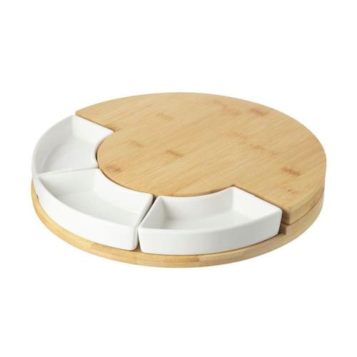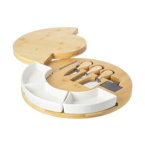 O jogo de petisqueira Home Style medindo 30,5 cm é produzida em madeira e acessórios em cerâmica, o jogo conta com 7 peças. São 3 facas para queijo com lâminas em metal e cabos em madeira.