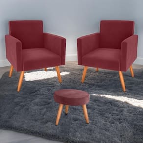 ALTURA DO PRODUTO COM EMBALAGEM (CM): 129 | LARGURA PRODUTO COM EMBALAGEM (CM): 65 | PRODUTO PRECISA DE MONTAGEM?: Sugerimos a contratação de um montador para a montagem do produto. Não nos responsabilizamos por causadas no ato da montagem. | LARGURA DO PRODUTO (CM): 64 | PESO PRODUTO COM EMBALAGEM (KG): 34 | INSTRUÇÕES/CUIDADOS: Limpar com pano macio e seco, não utilizar produtos abrasivos | CORES DO PRODUTO (FILTRO DE CORES): Vinho | COMPRIMENTO PRODUTO COM EMBALAGEM (CM): 65 | CONTEÚDO DA EMBALAGEM: 2 Poltronas e 1 Puff | É KIT?: Sim | MATERIAL PRINCIPAL: Tecido | PESO DO PRODUTO (KG): 34 | COMPRIMENTO DO PRODUTO (CM): 60 | QUANTIDADES DE CAIXAS DE EMBALAGEM: 3 | DESCRIÇÃO DO TAMANHO: 80x64x60 cm | MATERIAL PARA FILTRO: Tecido | ESTADO DE ORIGEM: PR | MARCA: CasaH | COR PREDOMINANTE: Vinho | PRODUTO: Poltronas e Puff | ALTURA DO PRODUTO (CM): 80
