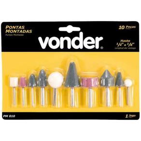 Jogo De Ponta Montadas 10 Peças Retifica Tip PMV - Vonder Indicado para retificar e desbastar pequenas peças em ferramentaria, fundições, rebarbação de furos e entalhes de difícil acesso;Possui formato que facilita o trabalho em locais de difícil acesso;Ponta rebolo fabricada em óxido de alumínio que confere maior vida útil. Part Number: 12.50.000.010; Especificações:Material: Composto de oxido de alumínio;Haste: 1/4 6mm ;Marca: Vonder;Tipo de Embalagem: Blister; Embalagem Contém 1 Cartela com 10 peças:5 pontas com haste de 3 mm 3 cônicas, 1 cilíndrica e 1 esférica ;5 pontas com haste de 6 mm 3 cônicas, 1 cilíndrica e 1 esférica ; Indicação de Uso: Utilizar em retificadoras para usinagem, retífica em geral para desbastes em locais de difícil acesso; Garantia de 3 Meses;