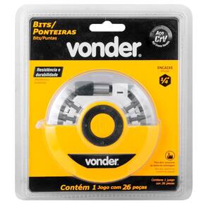 Jogo de pontas bits com 26 peças vonder. Produzido em aço cromo vanádio, proporcionando maior resistência e durabilidade. Acabamento fosfatizado, que aumenta a proteção contra oxidação/corrosão