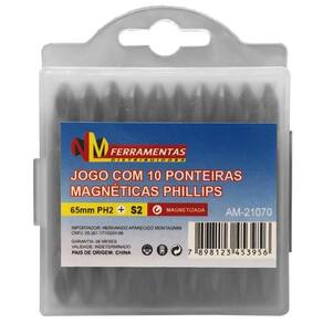 Jogo De Ponteira Ph2 Magnética 65mm Com 10 Peças NM Ferramentas - Jogo com 10 ponteiras. - Ponteira dupla 65 mm. - Magnética. - Usada em diversas medidas de parafusos 3,0/3,5/4,0/4,5/5,0 - Aço carbono Ficha técnica - Formato de venda: Kit - Ferramentas compatíveis: Furadeira elétrica - Modelo: AM-21070 Medidas aproximadas do produto - Comprimento: 9 cm - Altura: 2 cm - Largura: 7 cm - Peso: 350 g Marca: Nm ferramentas Ean: 7898123453956