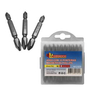 Jogo De Ponteira Ph2 Magnética 65mm Com 10 Peças NM Ferramentas - Jogo com 10 ponteiras. - Ponteira dupla 65 mm. - Magnética. - Usada em diversas medidas de parafusos 3,0/3,5/4,0/4,5/5,0 - Aço carbono Ficha técnica - Formato de venda: Kit - Ferramentas compatíveis: Furadeira elétrica - Modelo: AM-21070 Medidas aproximadas do produto - Comprimento: 9 cm - Altura: 2 cm - Largura: 7 cm - Peso: 350 g Marca: Nm ferramentas Ean: 7898123453956