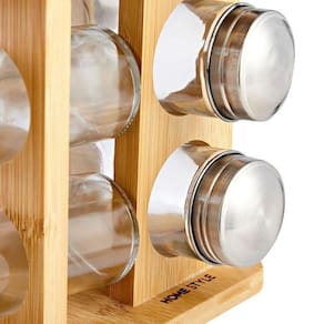 O conjunto é composto por base em bambu. São 12 porta condimentos em vidro e tampa em aço inox. Cada um tem capacidade para armazenar até 85 ml.