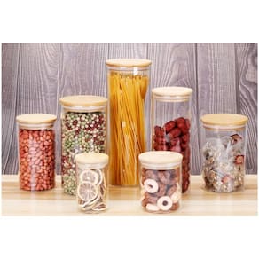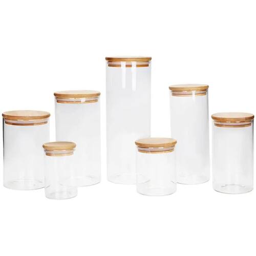 O design sofisticado e sustentável com vidro transparente e tampas de bambu combina funcionalidade com estilo.