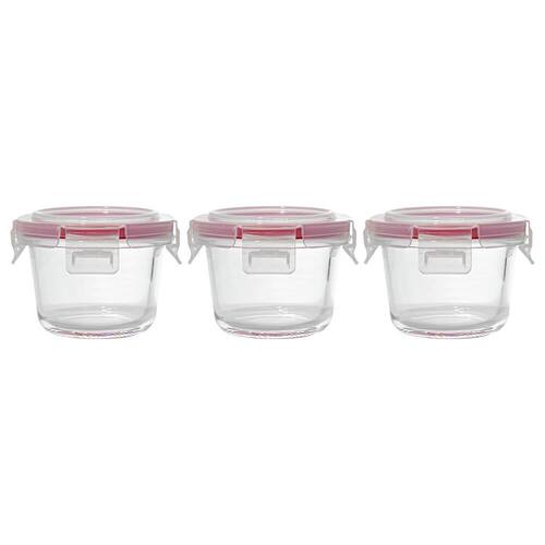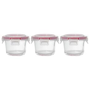 Os Potes de Vidro da Casambiente são feitos em vidro com tampa de plástico e vedação hermética em silicone na cor vermelha. É composto por 3 peças, sendo cada pote com 200ml de capacidade, 10cm de diâmetro e 7 cm de altura.