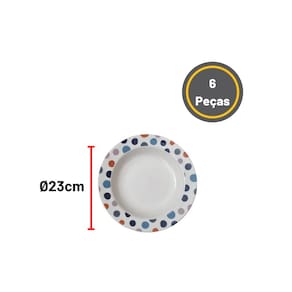 Especificações Técnicas: Tipo: Prato Fundo Diâmetro: 23 cm Material: Porcelana Estampa: Poá (bolinhas multicoloridas) Cor predominante: Branco com borda decorada Acabamento: Brilhante e esmaltado Cuidado:- Para limpeza, remova a sujeira com uma esponja macia, tire todo o resíduo de sabão e seque bem.- Não utilize abrasivos ou utensílios pontiagudos.- Submeter o prato a mudanças buscas de temperatura pode causar choque térmico e danificar seu produto.Transforme suas refeições em momentos especiais com o prato BHR Casa da linha Poá. Adquira já o seu kit com 06 unidades e adicione um toque de elegância à sua mesa!