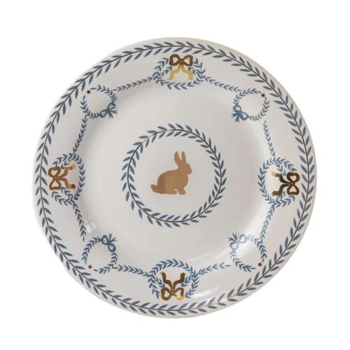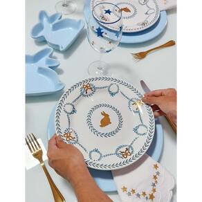 As datas especiais merecem uma produção especial. Trouxemos os lindos pratos COELHO GOLD para você comemorar com sua família. Material: Peças em Cerâmica faiança, artesanal de fabricação nacional, não refratária, produzida de acordo com as tradições da Indústria ceramista de Alcobaça / Portugal. Tamanho: 27x27x3 cm Cor: branco, azul e dourado Cuidados com a peça: Não deixar gordura, lavar com a esponja do lado macio. Kit: 6 pratos rasos Ean: 7898708612150