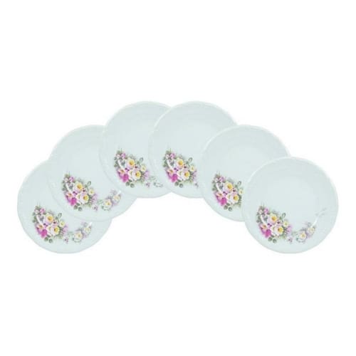 A delicadeza das rosas e a sutileza dos tons pásteis é o que define uma das decorações mais tradicionais da marca. O estojo é composto por 6 pratos rasos com 26 cm.