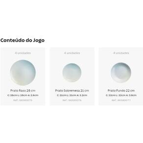 O jogo inclui 4 pratos fundos de 22 cm, 4 pratos rasos de 28 cm e 4 pratos de sobremesa de 21 cm.